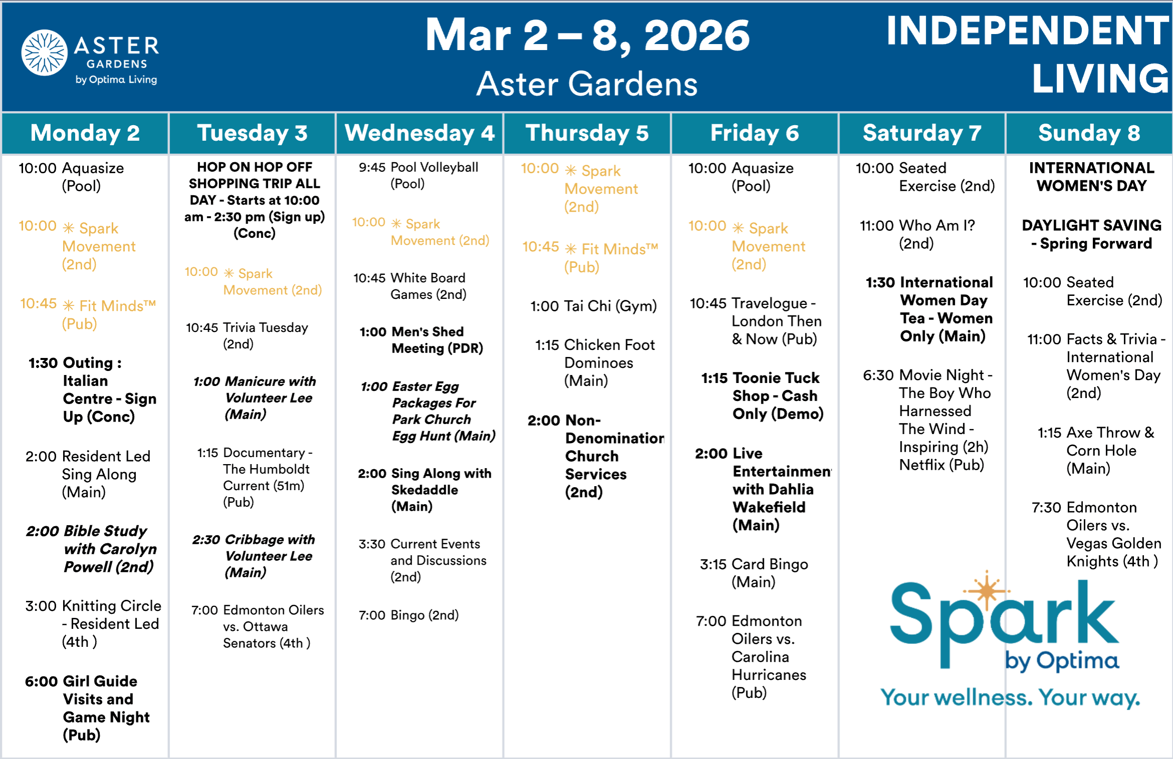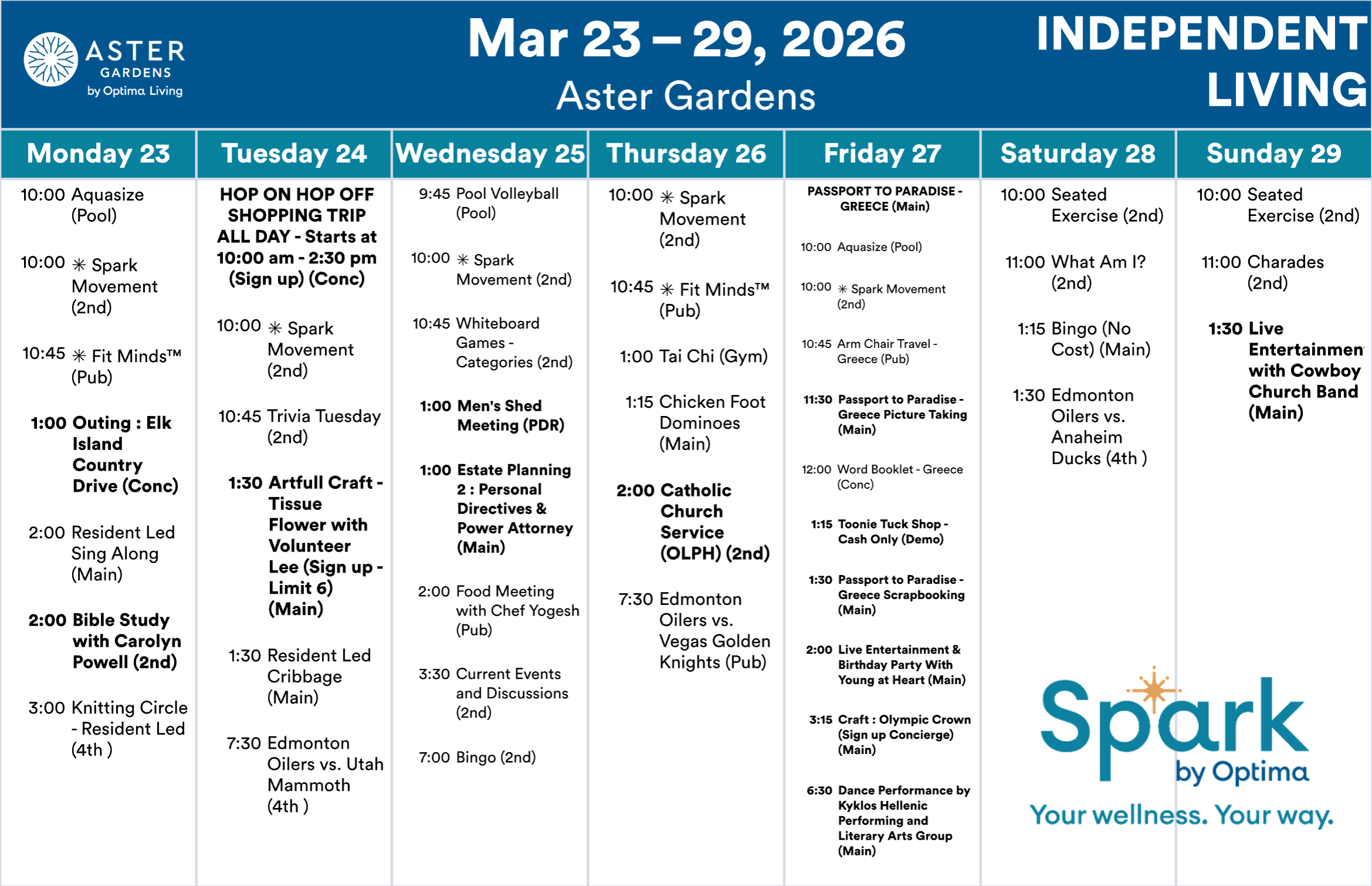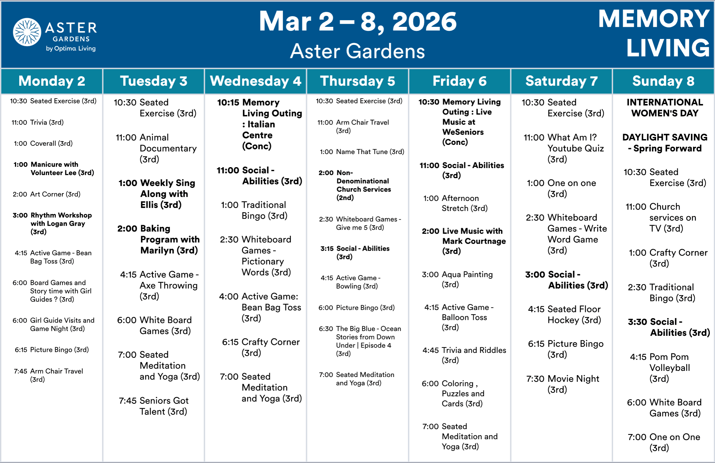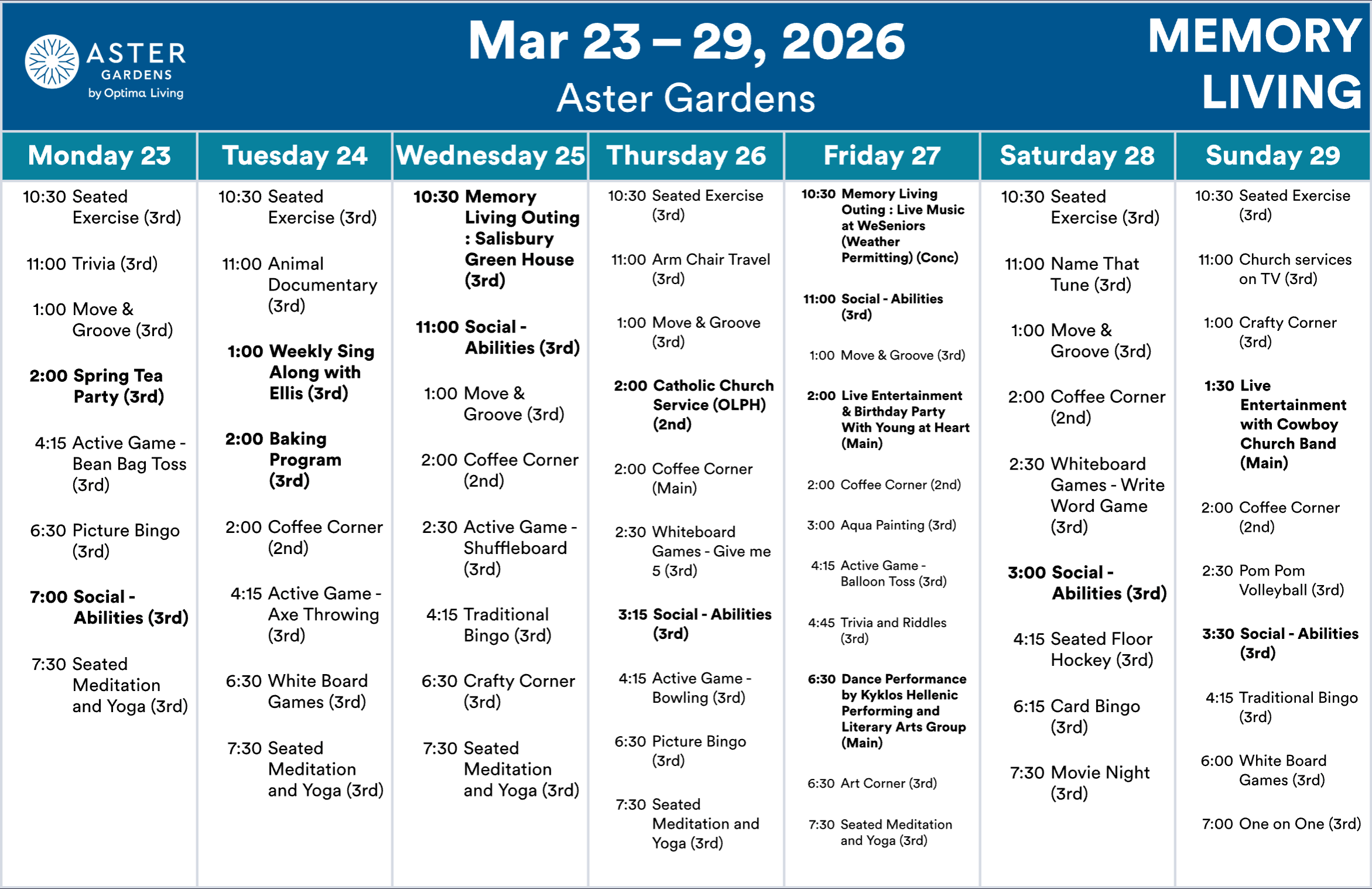 Aster Gardens events subject to change. Not all events open to the public. Call for details.